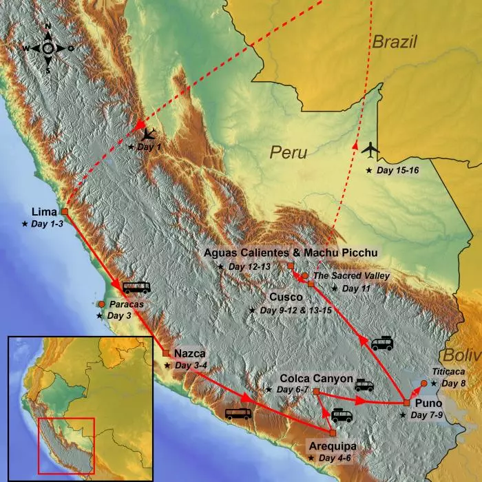 Peru is an incredibly exciting country to tour. Your adventure begins in the capital, Lima, and continues to the ‘mini-Galapagos’, Islas Ballestas, where you can discover arched rock formations, blue-footed boobies, penguins, and sea lions. This is also the gateway to see La Candelabra on the Paracas Peninsula. One of the highlights of the tour is a flight over the Nazca Lines, which are only visible from above. You will visit the ‘White City’ Arequipa and the dramatic Colca Canyon. On the world’s largest high-altitude lake, Lake Titicaca, you’ll meet local communities and learn about their culture and daily life. Your journey will continue to the ancient, elegant Inca capital of Cusco and the Sacred Valley, with visits to the museum-like town of Ollantaytambo and the bustling town of Pisac, famed for its markets and impressive ruins. Another major highlight is the world-famous citadel of Machu Picchu, where you’ll be enchanted by views of soaring mountains and misty forests, before heading back to Cusco where your departure day begins.