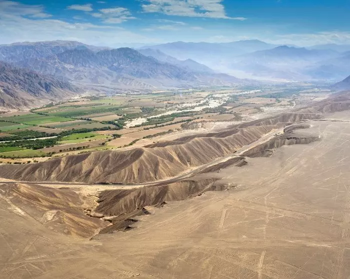 The small town of Nazca is like a lush green oasis surrounded by desert and high dunes. The town features on the international map due to its mysterious geoglyphs of animals and geometric figures in the desert sand. The figures have been there for more than 2,000 years and have not been erased by weather or wind due to the minimal rainfall in the area.