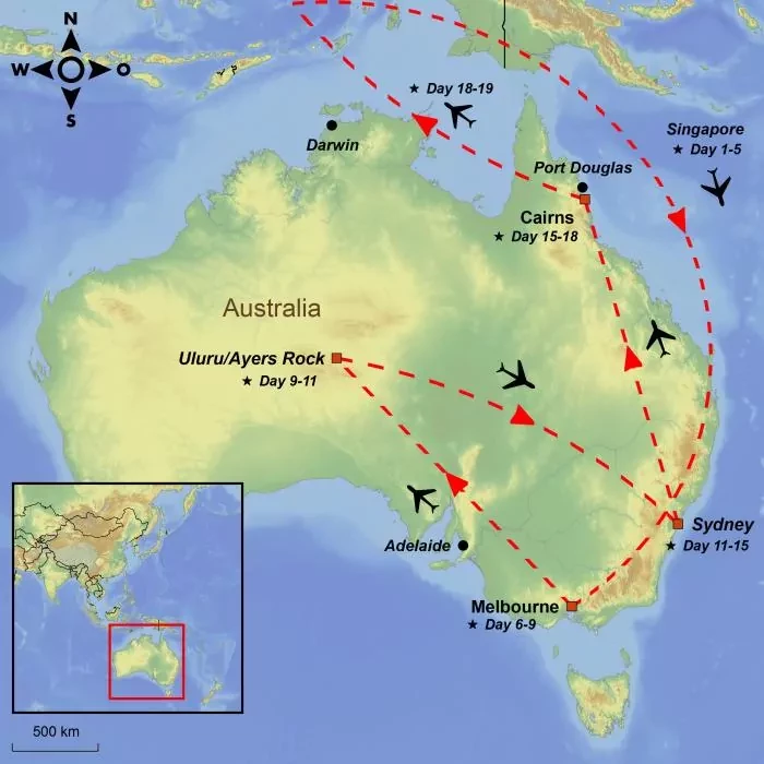Look forward to making a stop in fabulous Singapore, before continuing to the amazing contrasts of Australia. Melbourne, Sydney and the red desert await you Down Under, before the tour rounds off in tropical Cairns.