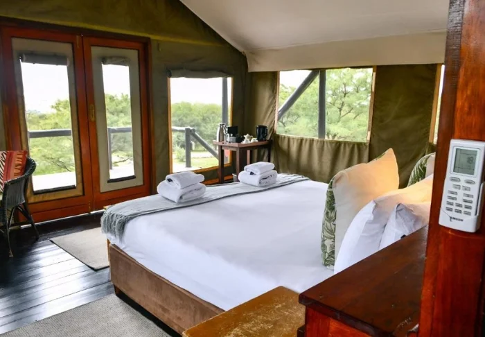 You’ll be staying in an elegant safari tent that combines solid brick walls with a canvas roof, creating a cosy yet rustic feel, while large windows let the light and the wilderness flood in. All tents are spacious and fitted with modern comforts, and each has a private veranda where you can savour the views and the sounds of the bush in peace and quiet.