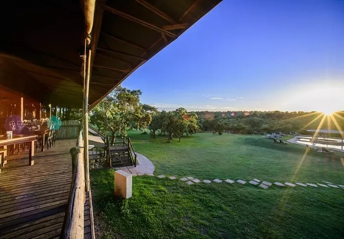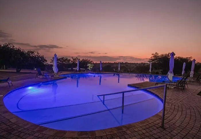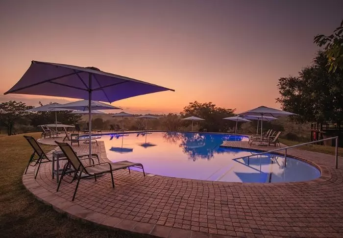 The camp is located in a private section within the Kruger National Park itself, and from the pool, you have an excellent view facing the National Park. You can often see a bloat of hippopotamuses in the river just beyond the big grassy field, and there are benches (and a fence!) set up for you to comfortably and peacefully sit and listen to them puff and frolic in the water below.