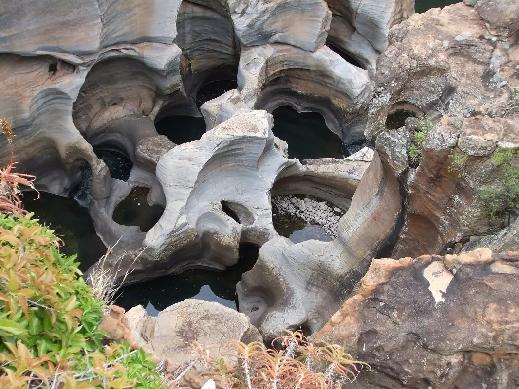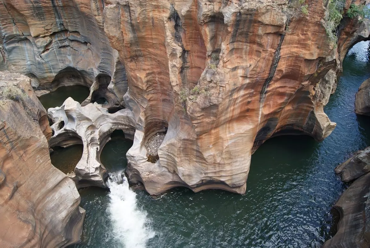 Today is given over to a beautifully scenic full-day trip along the Panorama Route through the dramatic Drakensberg Mountains. The mountains themselves are red, and form a magnificent contrast to the green trees and plants. On the trip, you will experience the breath-taking Blyde River Canyon. Measuring 700 m deep and 60 km long, it is the third-largest canyon in the world. You will stop at the three best vantage points along the canyon: God’s Window, Bourke’s Luck Potholes and The Three Rondavels – three beautiful and remarkable rock formations whose shape calls to mind the round huts previously to be found in local villages in many parts of southern Africa. The Panorama Route will also take you past a number of waterfalls, and you will have the chance to stop to admire one of them. This could, for example, be the Berlin Falls, where the water cascades down into a lake from a height of 150 metres. Or you may stop at the Lisbon Falls, located where the Blyde river splits in two and then drops 92 metres down an almost vertical cliff, before coming together to form a single river once more. There are many other waterfalls, however, and your guide will decide where you stop. One of the most spectacular sights you will see during the day is sure to be the Bourke’s Luck Potholes – cylindrical holes carved into the rocks by the action of water and sand over thousands of years. You can see this amazing natural phenomenon right up close from bridges built over the peculiar holes.
