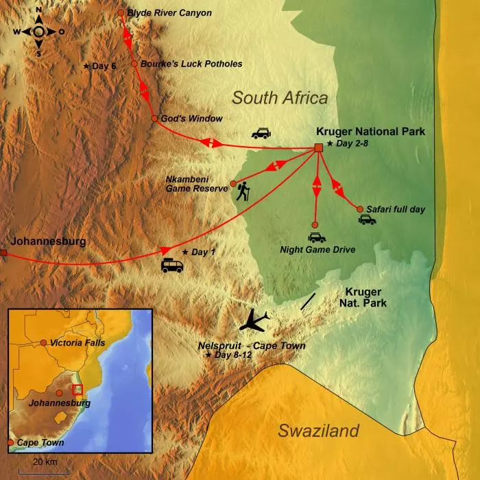 Experience the exciting and rich animal life on a safari tour in South Africa’s renowned Kruger National Park. Join a bushwalk, see the Panorama Trail and finish your tour in beautiful Cape Town.