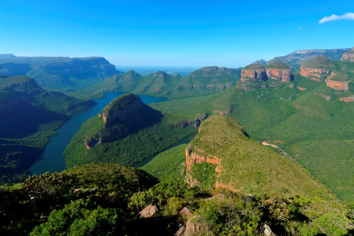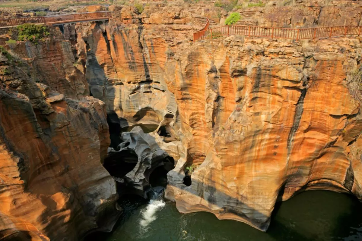Today is given over to a beautifully scenic full-day trip along the Panorama Route through the dramatic Drakensberg Mountains. The mountains themselves are red, and form a magnificent contrast to the green trees and plants. On the trip, you will experience the breath-taking Blyde River Canyon. Measuring 700 m deep and 60 km long, it is the third-largest canyon in the world. You will stop at the three best vantage points along the canyon: God’s Window, Bourke’s Luck Potholes and The Three Rondavels – three beautiful and remarkable rock formations whose shape calls to mind the round huts previously to be found in local villages in many parts of southern Africa. The Panorama Route will also take you past a number of waterfalls, and you will have the chance to stop to admire one of them. This could, for example, be the Berlin Falls, where the water cascades down into a lake from a height of 150 metres. Or you may stop at the Lisbon Falls, located where the Blyde river splits in two and then drops 92 metres down an almost vertical cliff, before coming together to form a single river once more. There are many other waterfalls, however, and your guide will decide where you stop. One of the most spectacular sights you will see during the day is sure to be the Bourke’s Luck Potholes – cylindrical holes carved into the rocks by the action of water and sand over thousands of years. You can see this amazing natural phenomenon right up close from bridges built over the peculiar holes.