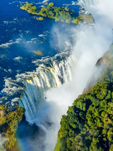 Up close, the falls are almost unreal. More than 1000 cubic metres of water per second cascade some 100 metres down the basalt ravine of Batoka Gorge. The falls are 1.7 km wide and form the border between Zambia and Zimbabwe.