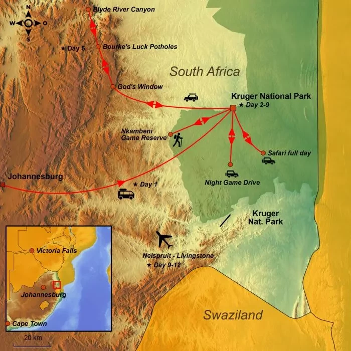 First you experience South Africa’s beautiful nature and animal life from your lodge, which is close to Kruger National Park. Finish your tour with one of the world’s most spectacular waterfalls.