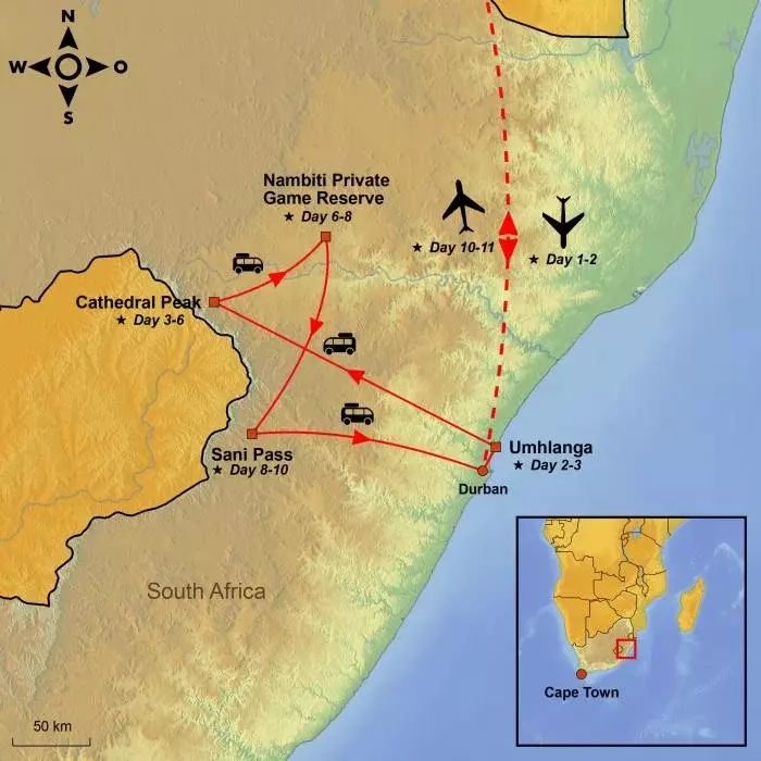 Today, you will depart from your selected airport with connecting flight(s) along the way. You are heading for KwaZulu-Natal province in South Africa.