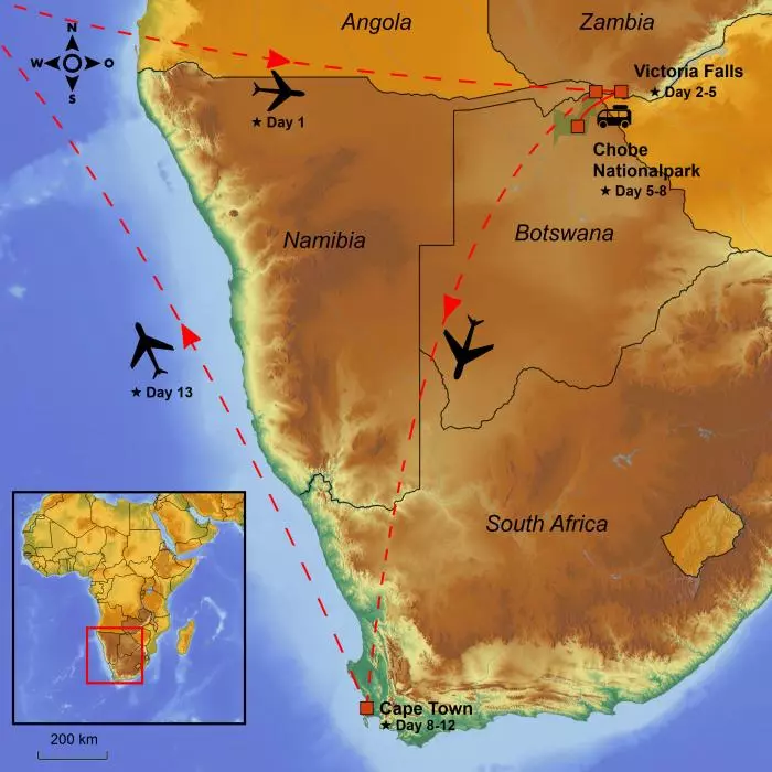 This tour combines three of the absolute highlights of southern Africa: the mighty Victoria Falls on the border between Zambia and Zimbabwe, a safari in Botswana’s amazing Chobe National Park and vibrant, scenic Cape Town in South Africa. Water, safari and city break in one and the same holiday.