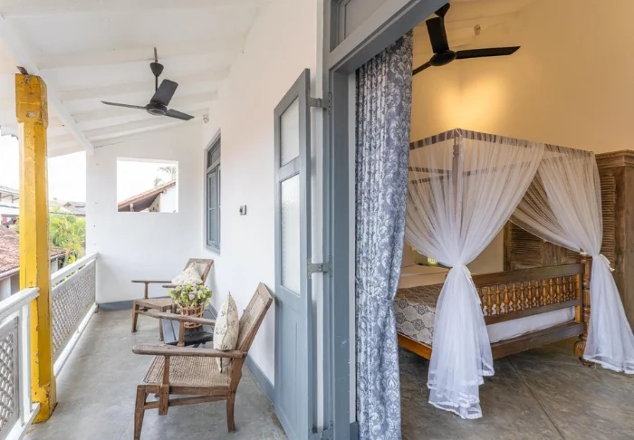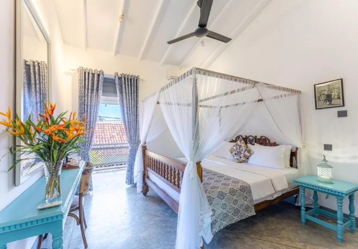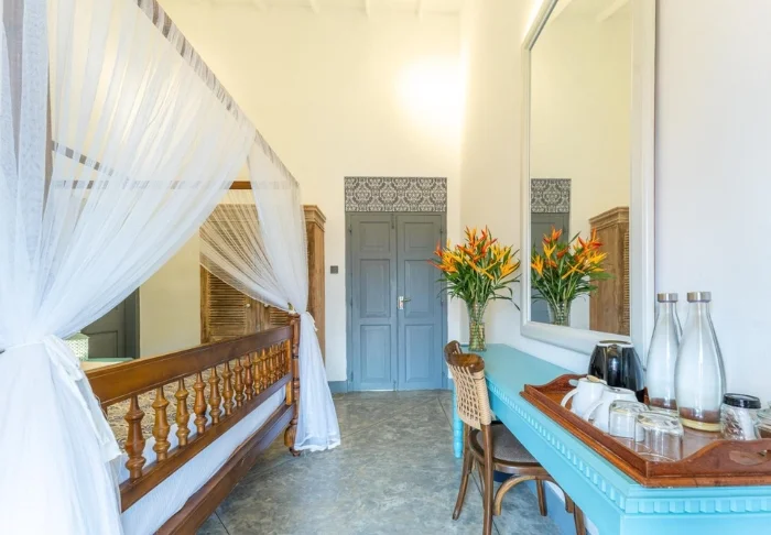 During your stay, you’ll be accommodated in a Standard room, providing a cosy and intimate ambience. The room is decorated in a classic style, featuring dark wooden furnishings and a four-poster bed that beautifully reflects the colonial character. You can take advantage of air conditioning, Wi-Fi, tea and coffee-making facilities, complimentary bottled water, and a private bathroom with an elegant shower and quality toiletries. Your own private balcony is the perfect spot to unwind and soak up the peaceful rhythm of everyday life on the fort’s narrow lanes.