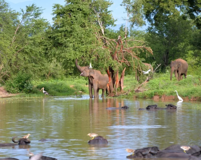 The park’s landscape is open and easy to take in, with grassy plains and low shrubs that make wildlife spotting a breeze. Besides elephants, you may be lucky enough to glimpse water buffalo, deer, crocodiles, or vibrant birds darting low across the watering holes.