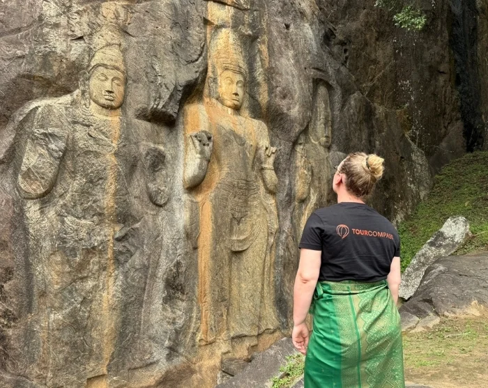 On your way, you’ll stop at the Buduruwagala Temple, which dates all the way back to the 10th century and is famed for its remarkably well-preserved rock carvings. The temple occupies a vast rock face, where a 16-metre-high Buddha statue stands, surrounded by six smaller figures showing the Buddha in various meditative poses. You’ll have time to appreciate their intricate detail and serene expressions in peace and quiet, as Buduruwagala remains a tranquil sanctuary, quite unlike some of Sri Lanka’s busier temples.