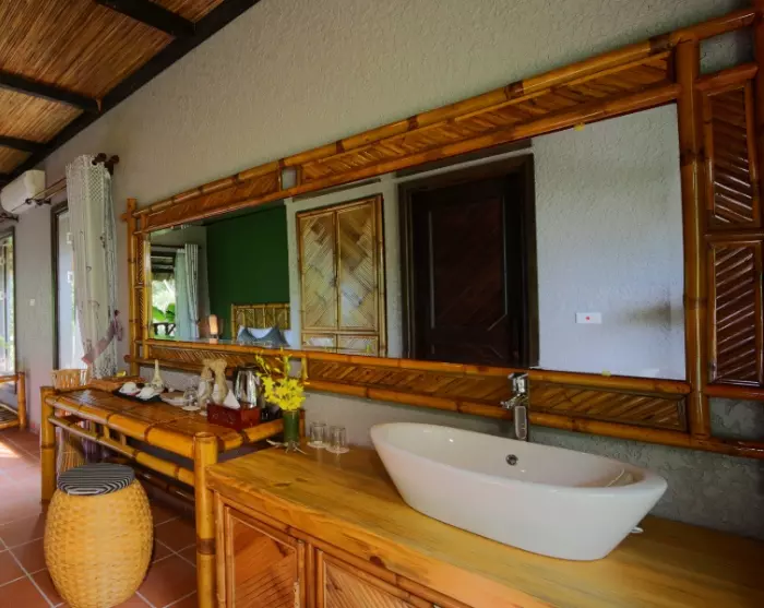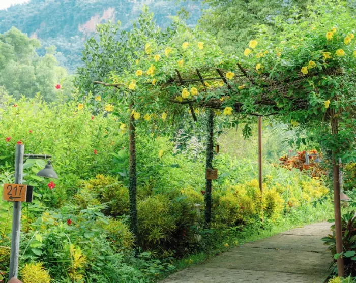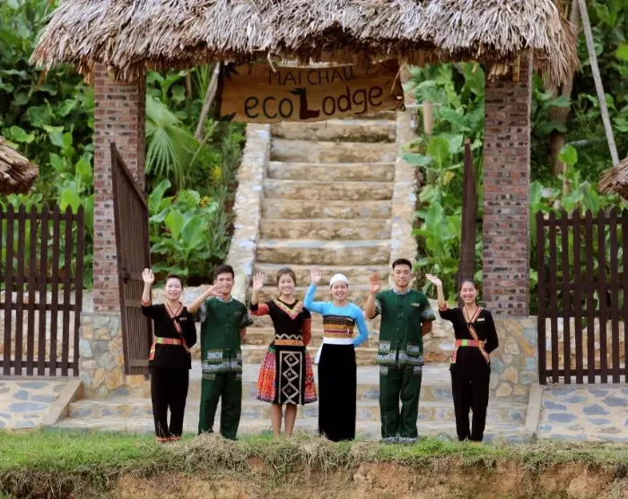 The ecolodge sits on a private hilltop in Na Phon village, overlooking Mai Chau’s green rice paddies, forests, and mountain scenery. Here, nature is not just a backdrop; it’s an active part of your stay. More than 80% of the lodge’s grounds are preserved as open space, and over half is dedicated to greenery, with gardens, vegetable plots, and fruit orchards. The buildings are designed in harmony with their surroundings and built mainly from natural, locally sourced materials such as bamboo, wood, stone, and palm leaves. Materials are gathered from the nearby area and used respectfully so the lodge blends seamlessly into the landscape.
