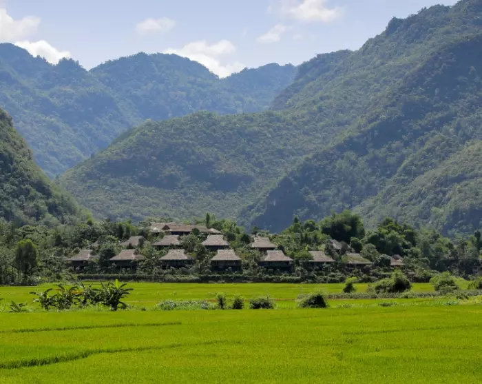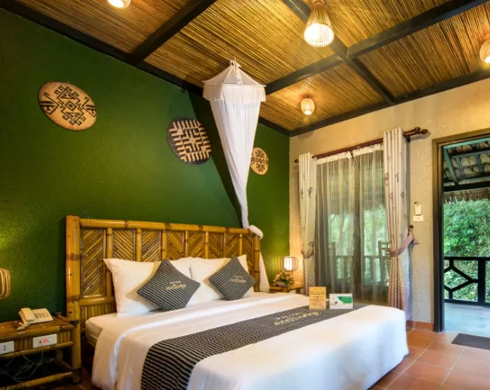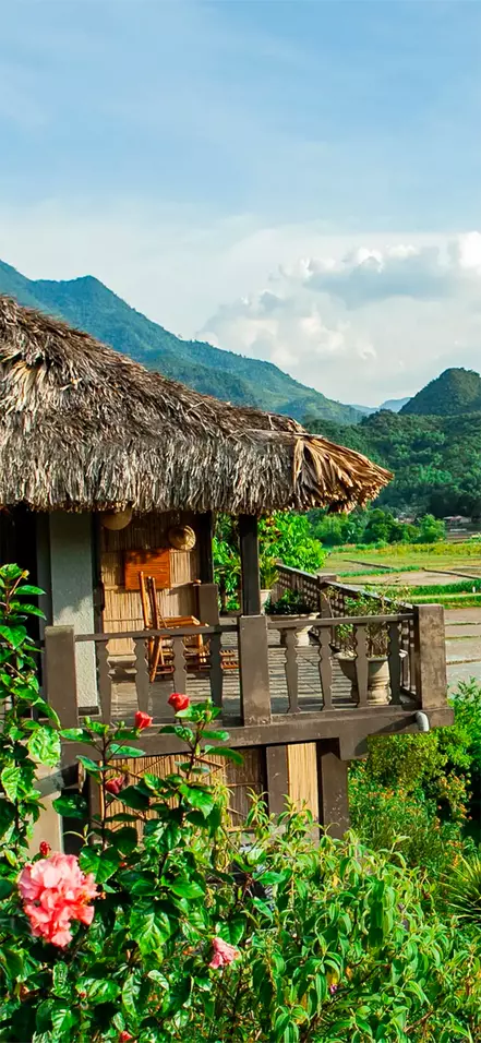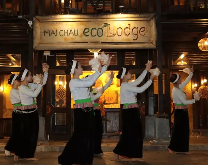 Mai Chau is home to several of Vietnam’s ethnic minorities, and local culture sits at the heart of the ecolodge. Around 90% of the staff are recruited from nearby villages, many of whom belong to the area’s ethnic minorities. The team wears traditional dress from their own ethnic groups, giving guests an authentic insight into local traditions. The lodge’s architecture is inspired by traditional stilt houses, and the rooms are decorated with colourful textiles and patterns that reflect the region’s cultural heritage. In the evenings, you can enjoy traditional music and dancing that brings the quiet mountain nights to life.