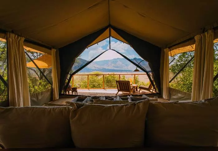 The lodge consists of 10 luxury tents, built around a steel shell with canvas walls, high ceilings and bricked bathrooms in extension of the room itself. All 10 luxury tents are built on an individual platform with a large wooden deck, from which you have the most beautiful views of Lake Eyasi.