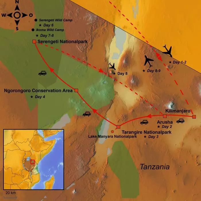 It is time to say goodbye to Serengeti and Tanzania. You are driven to central Serengeti, from where you fly towards Arusha. Here you are met by a guide and driven to Kilimanjaro International Airport, from where your journey home begins.