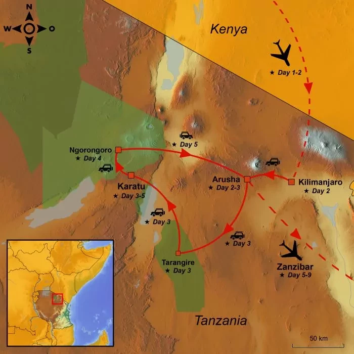 You arrive at Kilimanjaro Airport in Tanzania Outside the airport, you’ll be met by one of our local guides who will drive you to your hotel just outside Arusha, where you’ll spend the night. The rest of the day is yours to do as you please: You can rest after the journey and perhaps take a dip in the hotel’s pool.