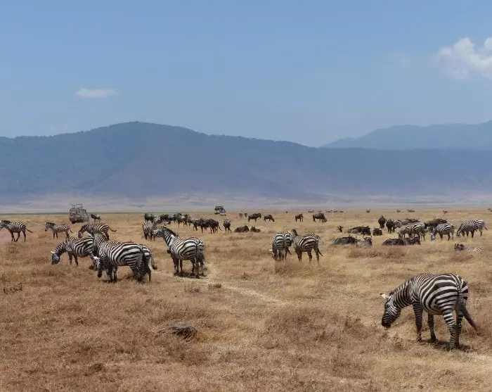 From Serengeti, the tour heads to the Ngorongoro Crater. You travel there by car, so it’s almost like one long game drive all day.