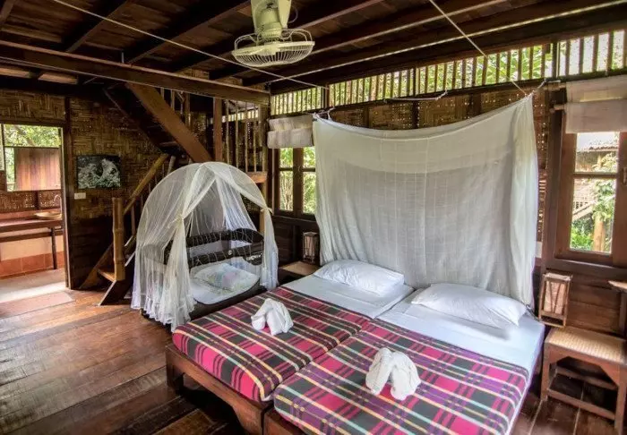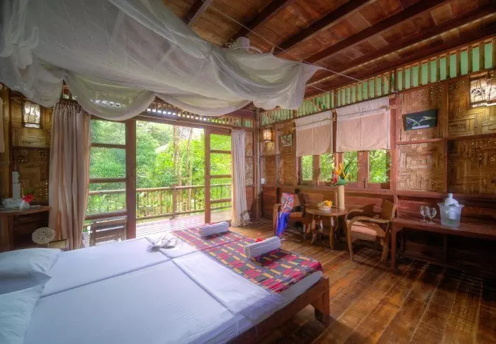 When the velvet darkness of the tropical night falls, the sounds become enchanting and the romantic atmosphere sets in. The cicadas start their chorus, the Mon people play music in the village, and the water murmurs beneath the flotel, which is illuminated solely by oil lamps.