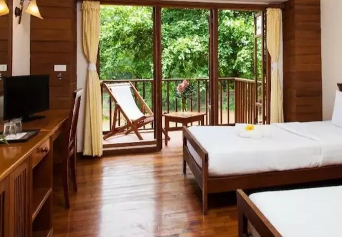 The resort has 42 comfortable rooms decorated in traditional Thai style with teak wood furniture. They are all furnished with comfortable beds, air conditioning, Wi-Fi, safety box, an electric kettle for making tea and coffee as well as a wardrobe and a desk. The bathroom is nice and simple with shower and toiletries. You can sit on your balcony with a cup of coffee and enjoy the tranquillity and view of the well-tended garden and the Yuam River, while the resort’s gardener waters the plants in the garden.