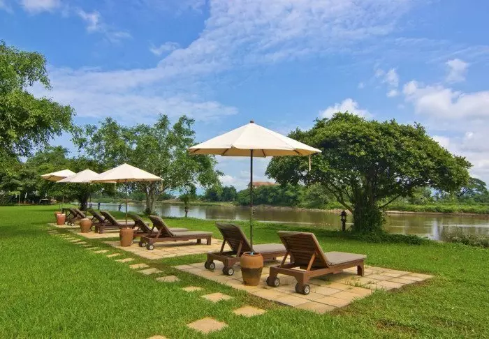 The resort is built in traditional Lanna style, in fine harmony with the surroundings. The buildings are spread out over the large plot, which consists of shady paths, lotus ponds, flowerbeds and a large lawn with sun loungers where you can relax and enjoy the view of the river.