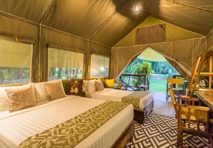 The camp consists of 38 luxurious canvas tents of between 26 and 32 m² which are raised half a metre above ground. All of them have proper beds, a private bathroom with hot water, a hair dryer and toiletries as well as a private veranda from which you can enjoy the silence and the lush surroundings. All tents also have Wi-Fi, air conditioning, a dressing table/desk, complimentary bottled mineral water, a fridge and an electric kettle for tea and coffee. After 10 pm, it’s quiet time at the camp – so no loud music, just the sounds of the jungle.