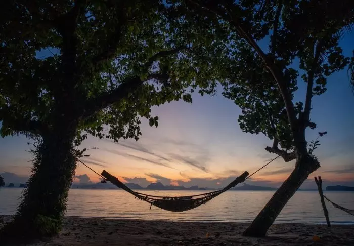 The sun is setting. Before changing for dinner, you jump in the “rooftop” pool for one last time today. From here, you can glimpse the sun, which is about to set over the Andaman Sea. The sky is a purple-red colour and the cicadas are singing around you.