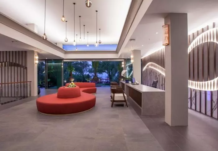 The hotel consists of several buildings set in lush surroundings, with immaculate gardens and tall palm trees swaying elegantly in the gentle breeze. The resort’s 116 rooms are crafted to provide you with a private and peaceful haven. Each room is bright, featuring a modern design that seamlessly blends with the natural world outside. From the furnished terrace, you can admire the verdant garden enveloping the resort while enjoying a relaxed morning coffee or a quiet moment. Every room is equipped with modern conveniences, including Wi-Fi, air conditioning, a safety box, a minibar, a coffee maker, and bottled mineral water. The bathroom is an experience in its own right, complete with both a bath and a rain shower, along with toiletries, a hairdryer, and a bathrobe.