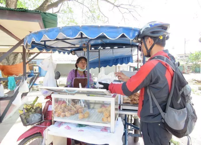 You may be lucky enough to cycle past a street vendor selling the popular Thai desserts, fried bananas and “kanom kai hong”, which are also known as swan eggs and have a taste similar to doughnuts.