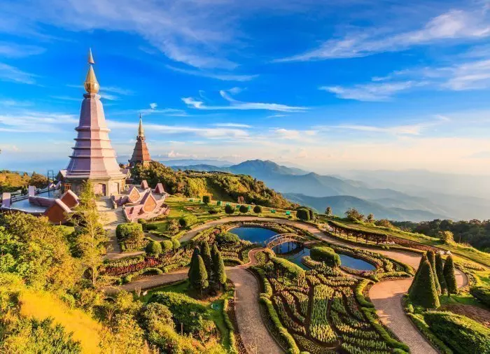 The next visit is to the mountain’s well-kept garden, where two large pagodas with golden spires tower into the sky. These were built in memory of King Bhumibol Adulyadej (Rama IX) and his wife. On a clear day, the views from up here are absolutely stunning, with evergreen forests blanketting the rolling mountains.