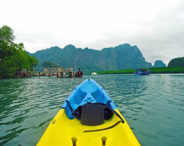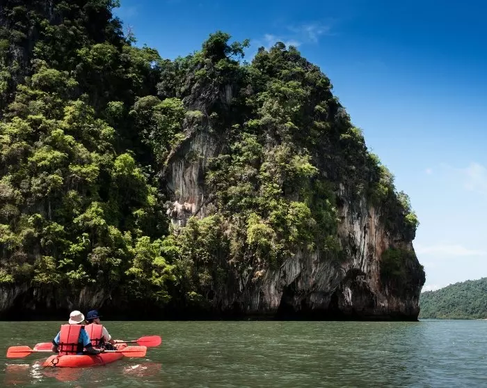 You’ll continue by long-tail boat to visit the islands of Koh Aung and Koh Talabeng with their iconic limestone karsts and picturesque bays. At Koh Talabeng, an unforgettable kayaking trip around the island awaits you, where you’ll experience its untouched nature, magnificent limestone karsts and fascinating caves.