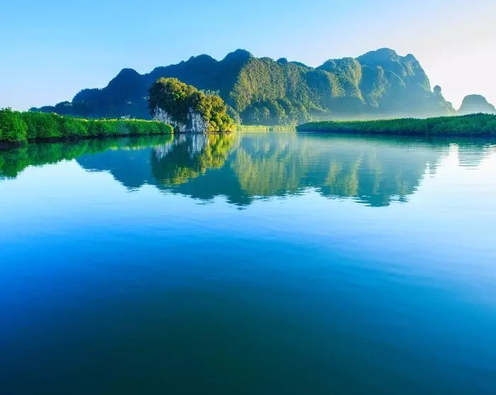 At the edge of the mangrove, the surroundings change, and you’ll now paddle through towering limestone karsts and secluded lagoons before heading for the small harbour.
