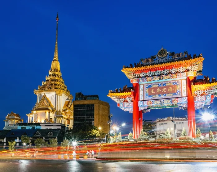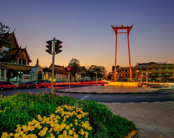 Next, you’ll hop back into a tuk-tuk and whizz through Chinatown, where neon lights and bustling streets create a truly unique atmosphere. A short stop is made at the 27-metre-high Giant Swing, a historic and cultural landmark by the Wat Suthat Thepwararam temple, beautifully illuminated at night and perfect for photos.