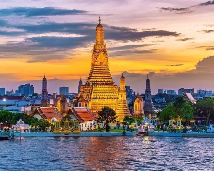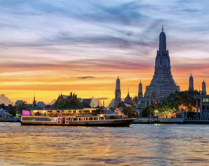 The evening concludes with a scenic drive past the Grand Palace and the City Pillar before you arrive by the riverside opposite Wat Arun. The temple stands beautifully lit on the far side of the Chao Phraya River, providing a stunning backdrop for the final stop of the tour.