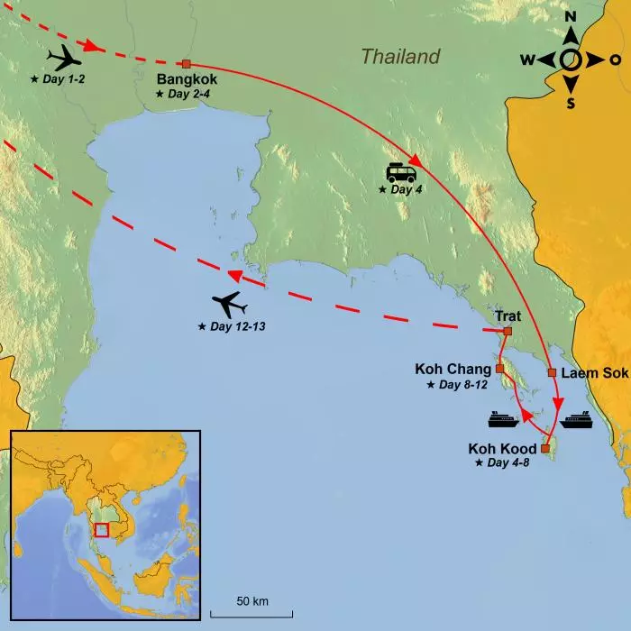 From the city, the journey continues with an adventurous island hopping in the northern Gulf of Siam to the islands of Koh Kood and Koh Chang.