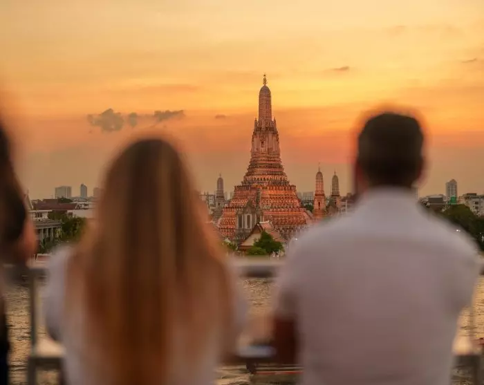 The evening concludes at a relaxed rooftop bar situated by the Chao Phraya River, boasting views of the illuminated Wat Arun temple. The view is unbeatable!