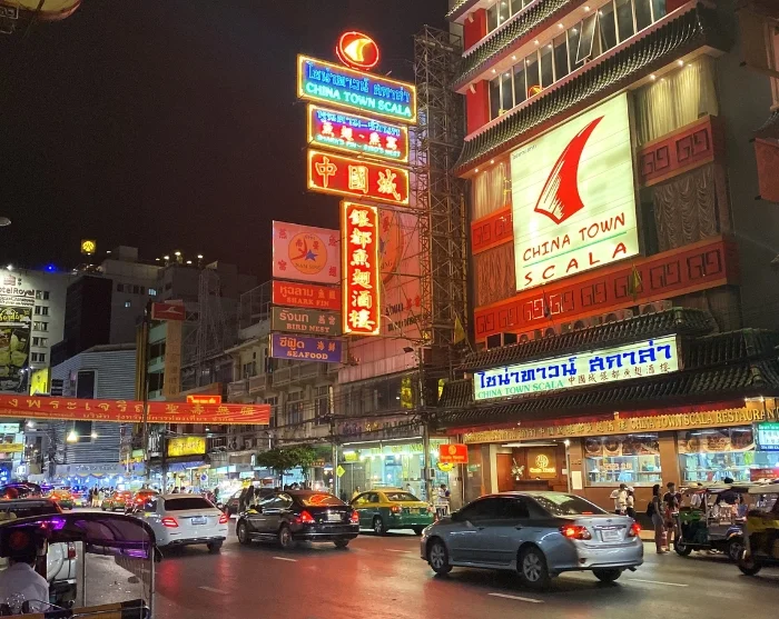 Next, you’ll hop back into a tuk-tuk and whizz through Chinatown, where neon lights and bustling streets create a truly unique atmosphere. A short stop is made at the 27-metre-high Giant Swing, a historic and cultural landmark by the Wat Suthat Thepwararam temple, beautifully illuminated at night and perfect for photos.