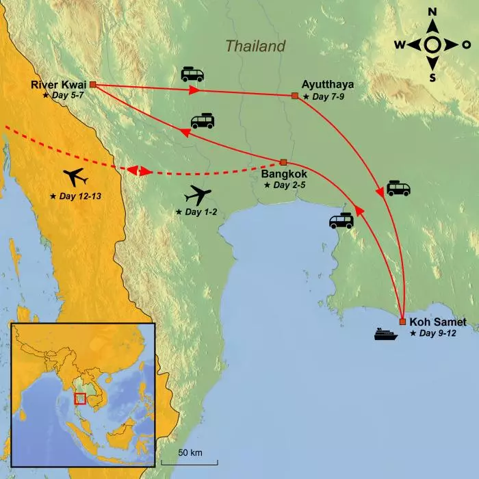 Experience Bangkok’s striking contrasts and fantastic food scene, while diving into history by the River Kwai. Explore the impressive temple ruins of Ayutthaya and conclude your journey on the beautiful beaches of Koh Samet.