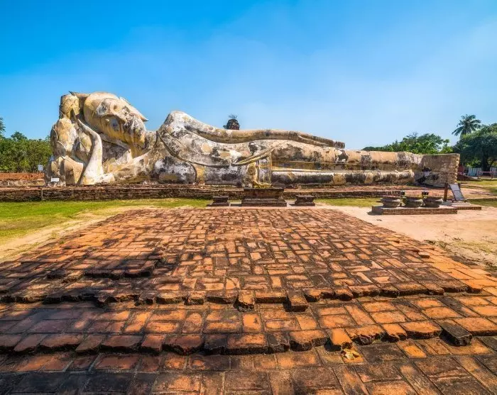 The final visit is to the old monastery Wat Lokaya Sutha. Not much remains here except for the remnants of the old floors, walls, and columns. The main attraction of the site is the 37-metre-long reclining Buddha with a serene smile.