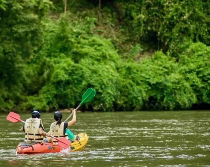 After a delicious breakfast, you’ll check out and be sailed by long-tail boat to River Kwai Jungle Rafts, where you can drop off your luggage until check-in later in the day.