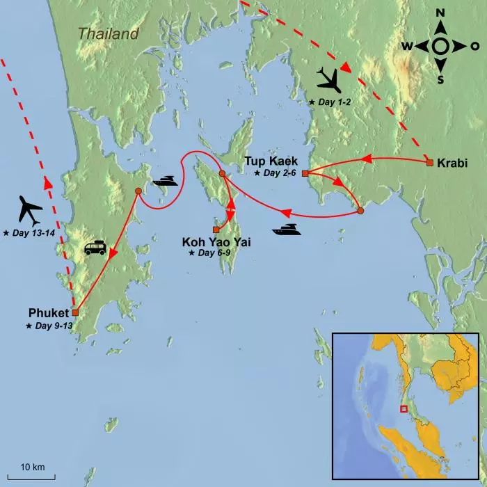 The tour starts in Krabi, where you can choose to stay at Tup Kaek or in Ao Nang. Relaxation and an eventful island hopping tour to the Andaman Sea’s most beautiful and unique islands and beaches await you here, including Phra Nang Beach – one of Thailand’s finest beaches.