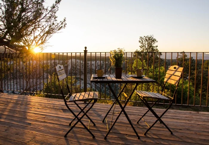 You’ll be staying in one of the ranch’s private log cabins which, in addition to their rustic charm, offer comfortable, modern facilities inside. Brew yourself a cup of coffee and prepare a snack in the simple kitchen, equipped with a coffee machine, microwave, and fridge, then enjoy it on your terrace or veranda overlooking the stunning natural surroundings. The cabins also feature air conditioning, free Wi-Fi, an indoor café table and chairs, as well as a private bathroom.