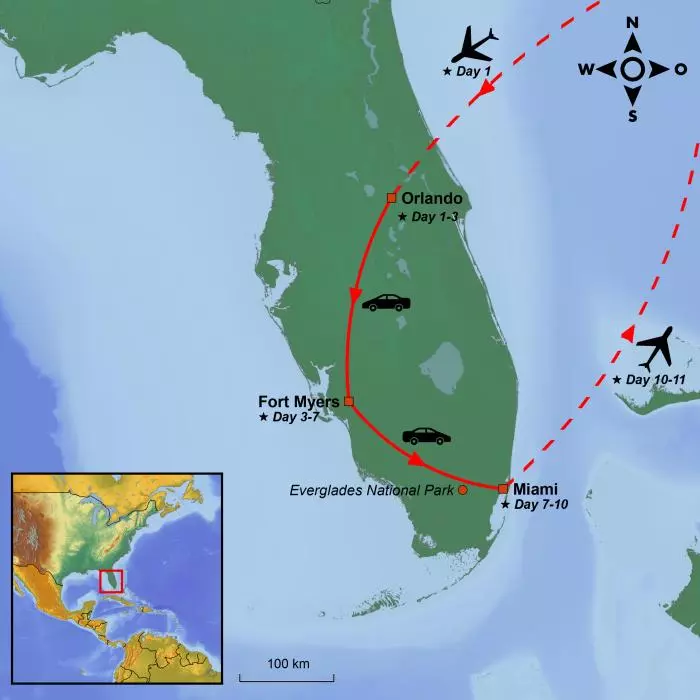 Today the time has come for you to travel to the southernmost state in the continental USA, namely Florida. You fly from your chosen airport to Orlando, which is centrally located in the northern part of Florida.