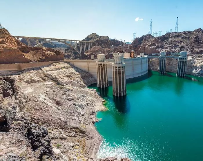 Around a 45-minute drive before you arrive in Las Vegas, you should make a detour to the enormous Hoover Dam. The dam, which cuts across the Colorado River, is an impressive construction with a height of 221 metres and a length of 379 metres. It is located right on the state line between Arizona and Nevada, which have a 1-hour time difference, as a giant clock there illustrates.