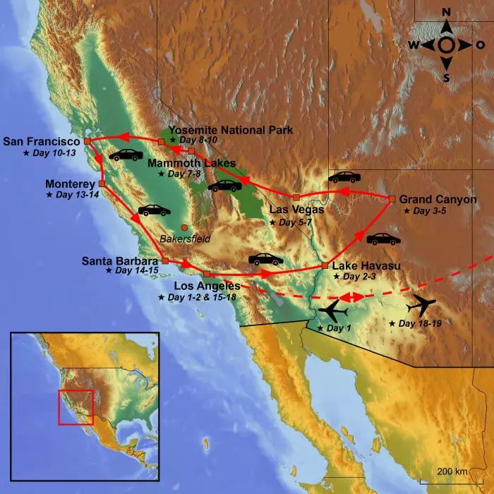 Finish your journey in Los Angeles, where you’ll have plenty of time to dip into the Pacific Ocean at one of the city’s beautiful beaches and unwind at a relaxed holiday pace under the Californian sun. There’s also time to explore a city brimming with history and entertainment: Hollywood, Beverly Hills, Disneyland, film studios, museums, and world-class gastronomy.