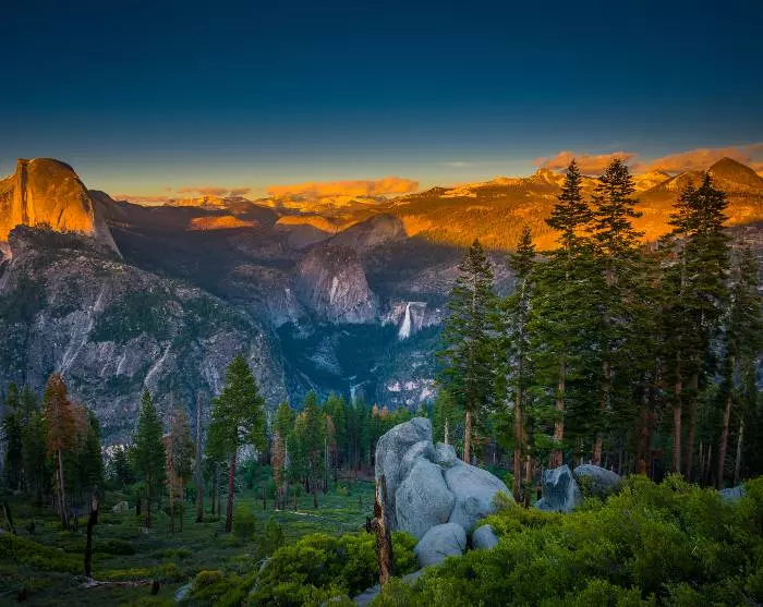 During the summer, you should visit the popular vantage point, Glacier Point, from where you can enjoy panoramic views of the park’s mountains and waterfalls. Come here before sunset and see the huge Half Dome mountain, being hit by the red colours of the sun. Shortly after sunset, you’ll also be rewarded with a starry sky that comes out right above your head – or what feels like it at any rate – here at an altitude of 2,200 metres. If you come up here on a one-way bus ticket during the day (booked at the Visitor Center), you can walk the scenic Four-Mile Trail that leads you back to the base of the park.
