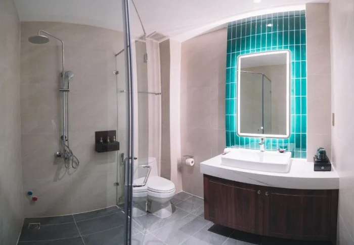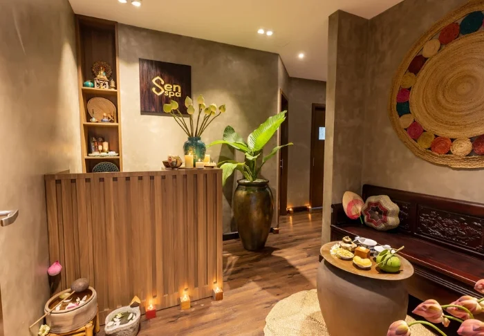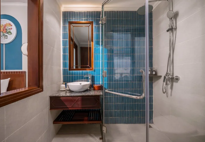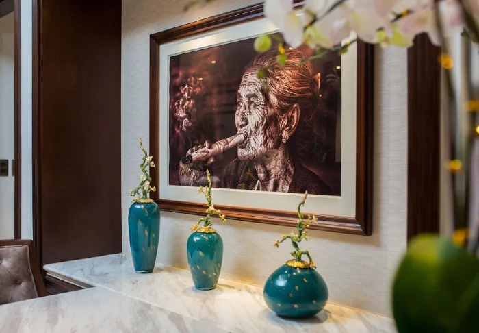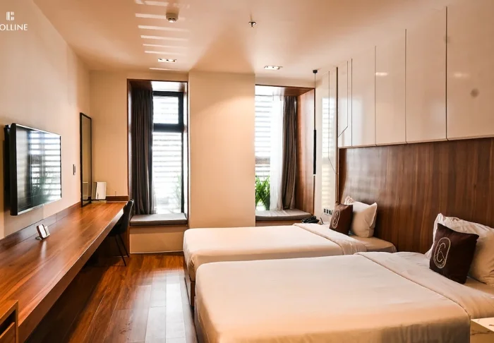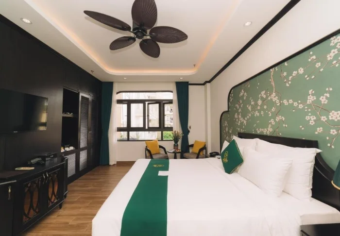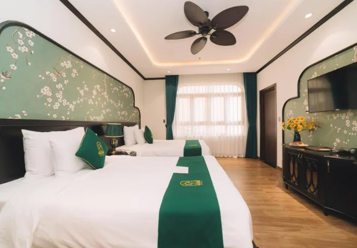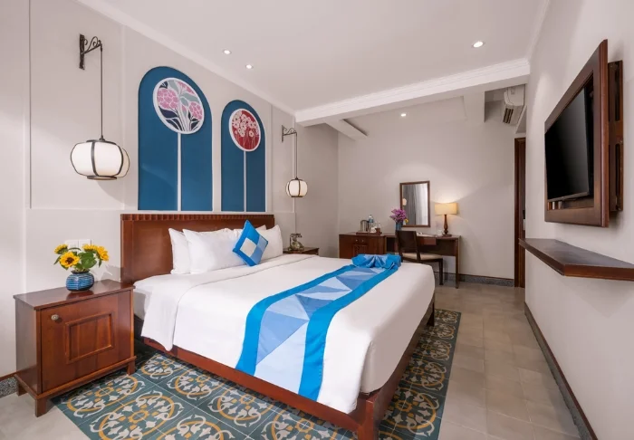 Your stay begins in a superior room, blending modern comfort with a touch of Vietnamese elegance. The rooms feature large windows letting in natural light, as well as wooden details and classic furnishings that create a warm and inviting atmosphere. Particularly striking are the wall panels adorned with blooming cherry branches, lending a local, artistic flair. All rooms are equipped with a double bed or twin beds, fridge, TV, safety box, kettle, air conditioning, and a private bathroom with toiletries and a hairdryer. Thoughtful touches throughout provide a calm retreat, making it easy to unwind after a day of exploring.
