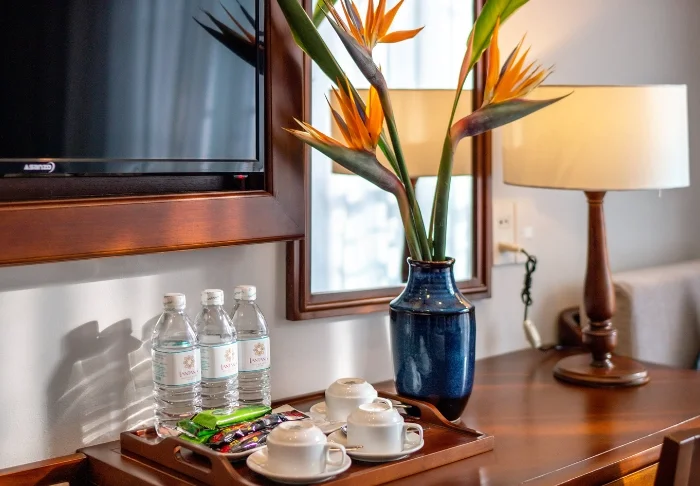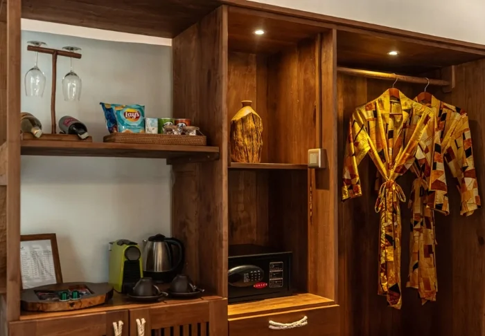 Your standard accommodation is a deluxe room featuring large windows and warm décor with dark wood, soothing tones, and soft textiles. The room offers a double bed or two singles, a private bathroom with a shower, complimentary toiletries, and a hairdryer. You’ll also find air conditioning, a safety box, Wi-Fi, a TV, a kettle, and bottled mineral water. The minibar is well stocked and included for the duration of your stay.