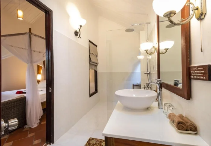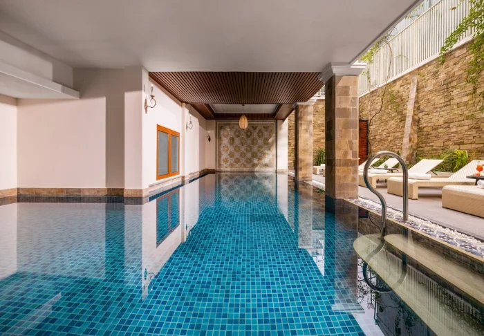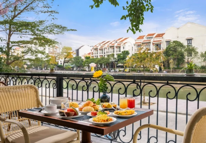 The hotel is built in a modern Vietnamese colonial style and offers just 37 rooms, ensuring an intimate and relaxed atmosphere. You’ll stay in a superior room as standard, which is bright and tastefully furnished with wooden décor, large windows, and subtle details inspired by Hoi An’s distinctive aesthetic. Your room will include air conditioning, Wi-Fi, a minibar, a kettle, a safety box, and a TV. The bathroom is equipped with a rainfall shower and complimentary toiletries.