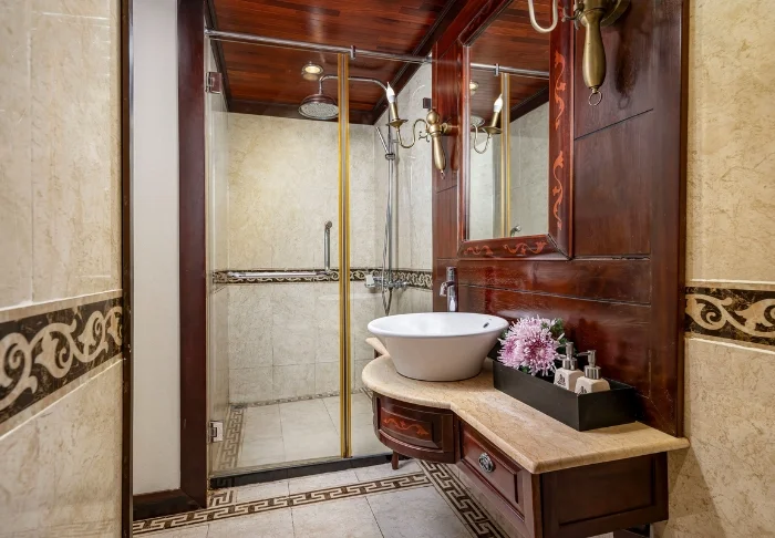 The ship boasts 18 cabins, and your accommodation will be in the ‘deluxe’ category as standard, featuring large windows that open directly onto the water. Here, you can wake up to the gentle lapping of waves and the soft morning light spreading over the bay. The cabins are warmly decorated using wood, with soft curtains, dark wooden furniture, and classic Vietnamese touches. Each offers a double bed or two single beds, with the possibility of an extra bed for a child under 12. There’s also air conditioning, a minibar, a kettle for tea and coffee, as well as a private bathroom with a shower and complimentary toiletries. The rooms are cosy and intimate, providing everything you need – and with a view like this, you couldn’t wish for more.