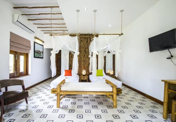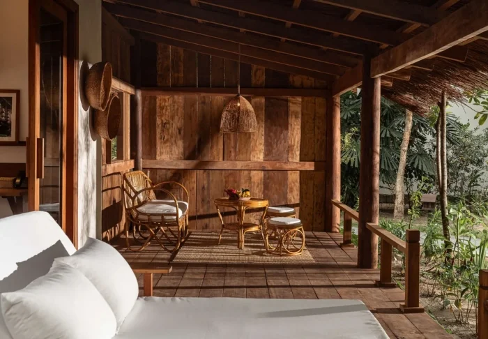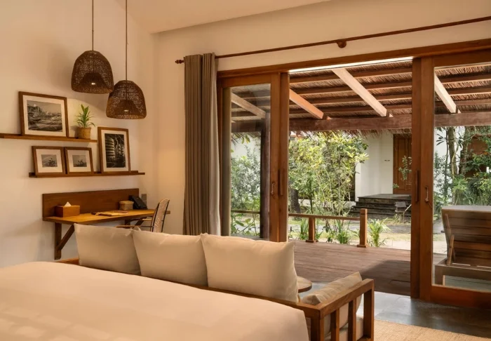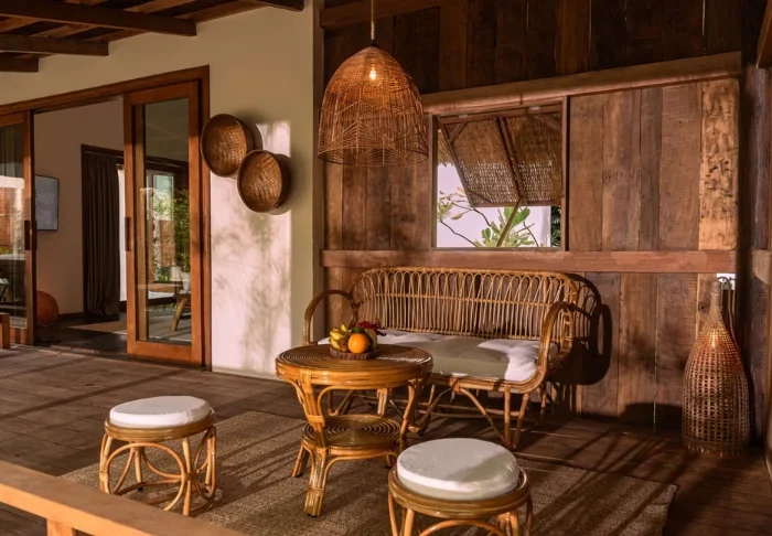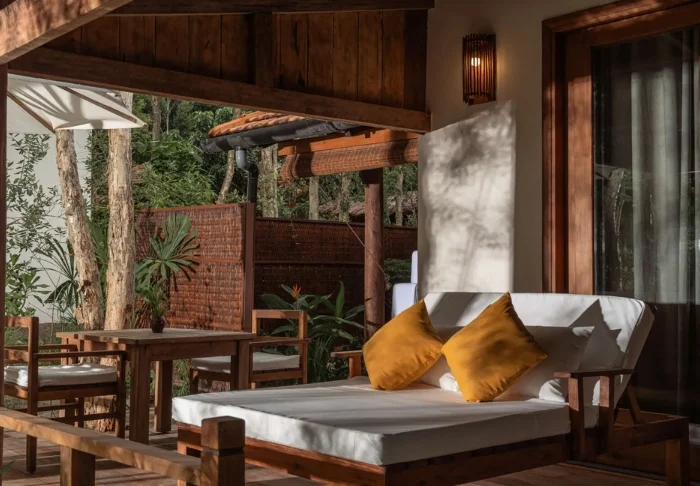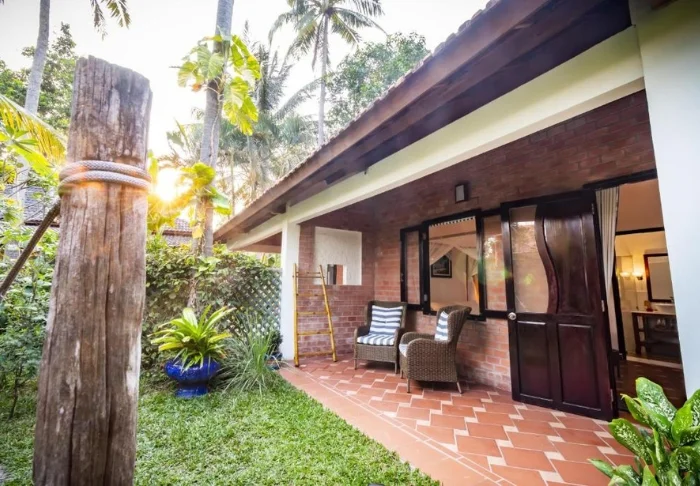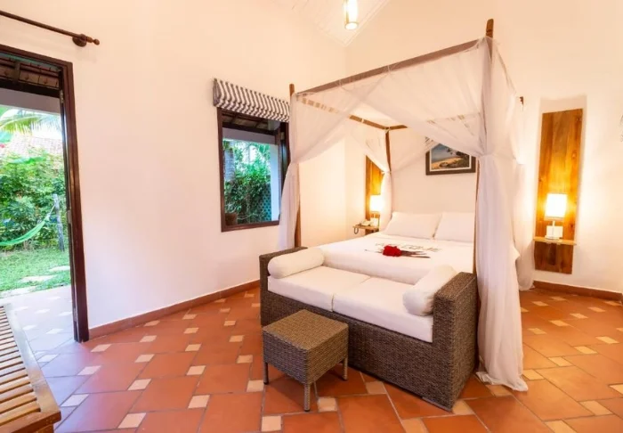 The Garden View rooms are situated in cosy pavilions nestled amidst the vibrant gardens. They are bright and furnished with bamboo furniture, mosquito nets draped over the beds, and colourful cushions that create a warm and inviting atmosphere. Large windows let the outdoors in, and from your private terrace, you can soak up the peace and admire the lush surroundings.